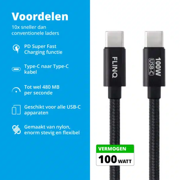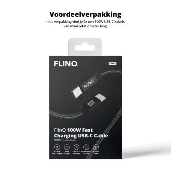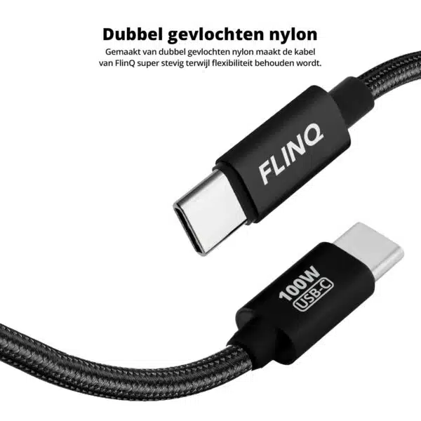 A dead battery on your smartphone, tablet or laptop is almost the worst thing that can happen to you these days. We pay with our smartphone, board planes, listen to music on it and spend many useless hours with it. In short: that battery percentage needs to stay up. With the extremely powerful FlinQ 100W Fast Charger USB-C (PD) Cable you ensure that your smartphone or other device is supplied with enough battery again in no time. With this charging cable at hand you’ll never get into trouble again