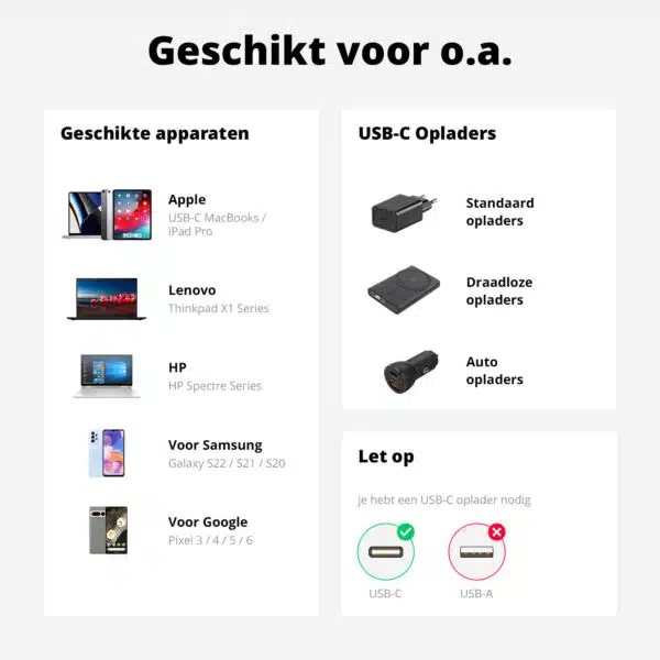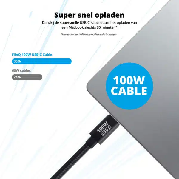 All you need is an adapter. After that this USB-C (PD) cable does all the work. The FlinQ 100W USB-C cable is a smart charging product specially designed to charge smartphones and other devices. This charging cable charges up to 10x faster than conventional chargers when using a 100W adapter.