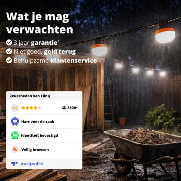 The FlinQ Construction Work Light string is a robust and versatile work light string that provides extra bright lighting, exactly where you need it. Whether you’re doing odd jobs in the garage, renovating, working in the garden or need extra light on the construction site, this construction lamp / work lamp delivers reliable performance under all conditions. Thanks to the plug & play design, high light output and the ability to connect multiple strings, this work light is suitable for both private and professional use.