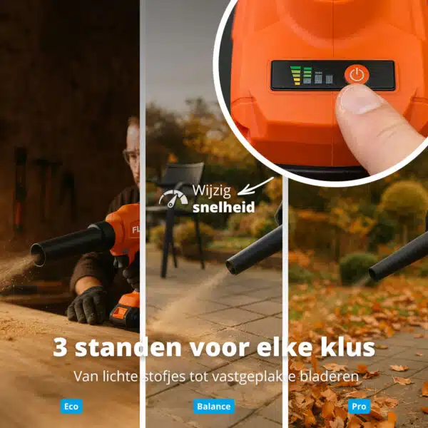With the three speed levels: Eco, Balance, and Pro, you can easily adjust the blowing power to your tasks. Use the Eco mode for light cleaning such as dust or sawdust, Balance for dry leaves, and Pro for stubborn dirt or wet leaves. This way, you always work efficiently and controlled, regardless of the situation.