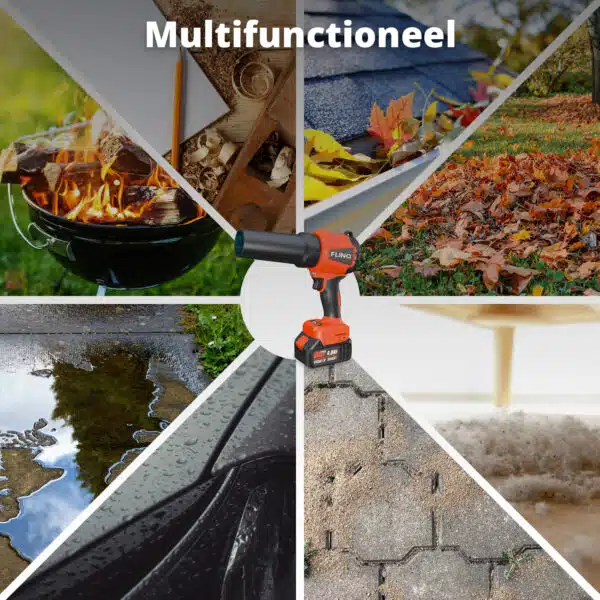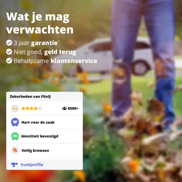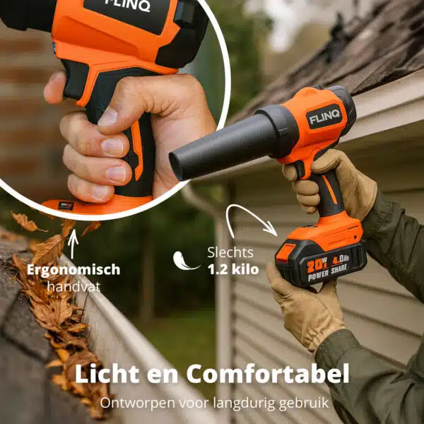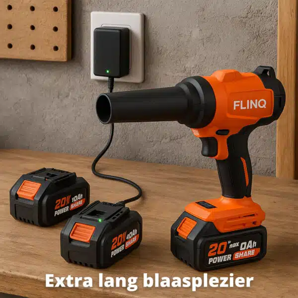 Compared to other hand blowers on the market, the FlinQ Premium Blower offers more power, safety, and ease of use in one compact device. Where many models are limited in power or working time, this blower offers three settings, dual batteries, and thermal protection. Moreover, it’s quieter, lighter, and multifunctional: ideal for garden, workshop, or garage.