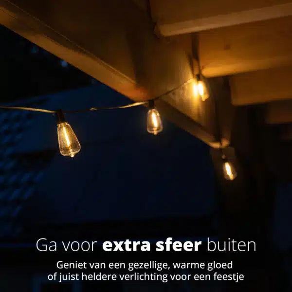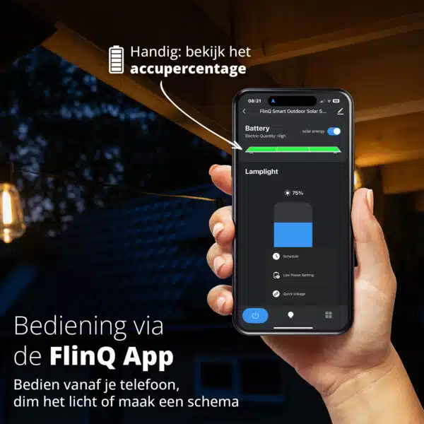 The FlinQ Smart Solar String Light offers a perfect balance between style and smart features for an advanced lighting experience. Thanks to the built-in timer via the FlinQ app and Bluetooth function, you can effortlessly set a schedule for automatic on/off switching, ideal for creating the right atmosphere at any time. The string light features a unique Filament WW LED that spreads warm white light. With voice control via Google Home or Alexa, you can easily adjust the lighting for a personalized experience in any space. If you want to control the string light from another country worldwide or use the scheduling function and voice control, add the FlinQ Smart Bridge to your order.