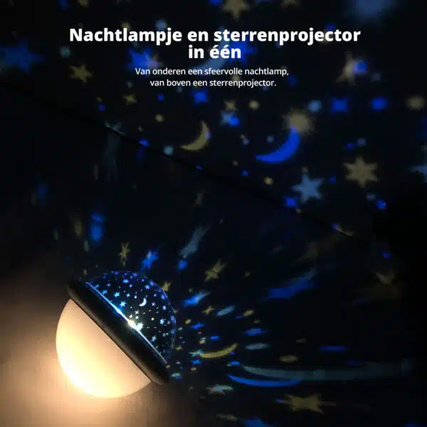 The bottom part is a dimmable (night) light that can provide warm white light or bright white light. You control both the lamp and the star projector by hand, and they can be used separately or together. Choose 1 fixed color (blue, white, or warm white) or switch between different colors and patterns. And if that’s still not enough, the star projector can also display all colors mixed together on the ceiling above or table below. Every child will fall peacefully asleep under such a cozy starry sky. The perfect gift for the holidays!