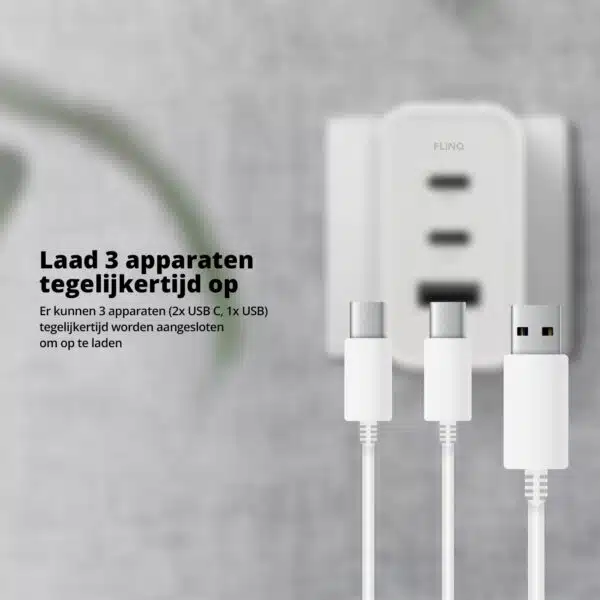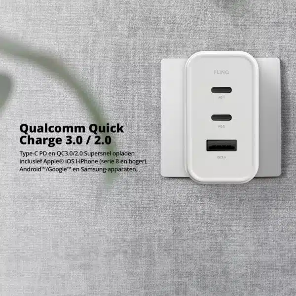 Het enige wat je nodig hebt is een stopcontact en een USB- of USB-c-kabel. Daarna doet deze wandlader al het werk. De FlinQ 65W Charger is een slim oplaadproduct dat speciaal is ontworpen om smartphones en andere devices op te laden. Deze oplader laadt namelijk tot wel 10x sneller op dan conventionele laders.