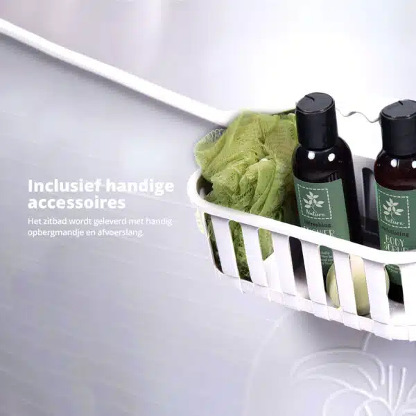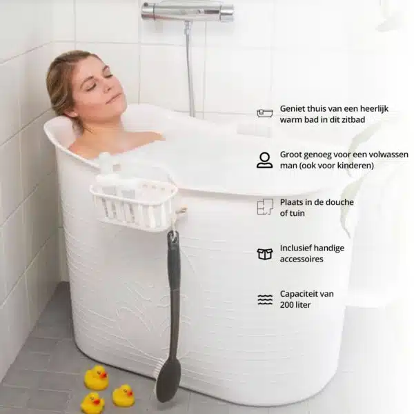 Heb jij geen bad omdat jouw badkamer te klein is of heb je nu eenmaal voor een badkamer gekozen zonder bad? Dan hebben wij voor jou een oplossing. Deze mobiele Badkuip kan je makkelijk in jouw badkamer of douche plaatsen. De bath bucket is geschikt voor รฉรฉn volwassene, zo kun je bijvoorbeeld na een lange dag werken heerlijk alleen even tot rust komen. Een zitbad kan het beste in de douche geplaatst worden. Je vult dan de bath bucket het makkelijkst, en kan je ook het water makkelijk laten wegstromen doormiddel van de afvoer die erbij geleverd wordt. Naast het zitbad en de afvoer ontvangt u ook een mandje waar je jouw douche producten kunt plaatsen.