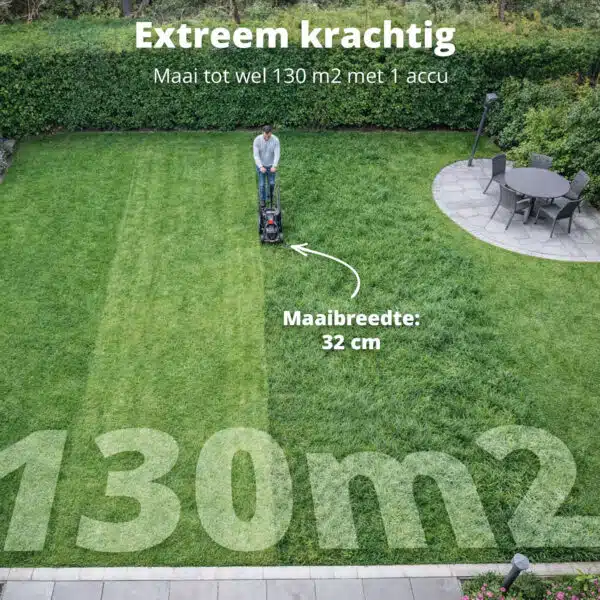 – Maait tot 130 m²: Op één 4.0 Ah accu