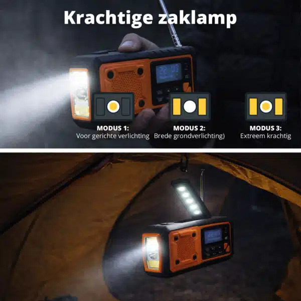 Met de krachtige 5000 mAh batterij laad je eenvoudig je telefoon of tablet op via USB of USB-C. Ideaal tijdens noodsituaties, reizen, kamperen of onverwachte stroomstoringen.