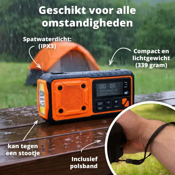 De noodradio is spatwaterdicht volgens IPX3 en gemaakt van stevig ABS-materiaal dat tegen een stootje kan. Dankzij het compacte formaat en het lichte gewicht van 339 gram neem je hem eenvoudig overal mee naartoe. De meegeleverde polsband zorgt voor extra gebruiksgemak.