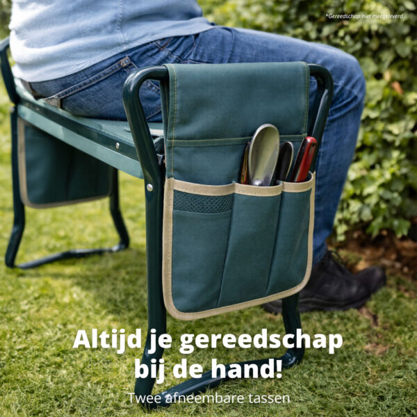 Dankzij de twee afneembare gereedschapstassen blijf je perfect georganiseerd. Met handige vakken kun je scharen, schoffels, schepjes, harken, sproeiers, tuinhandschoenen en meer gemakkelijk opbergen en altijd binnen handbereik houden. Geen heen-en-weer geloop meer naar de schuur, je hebt alles wat je nodig hebt direct bij je.