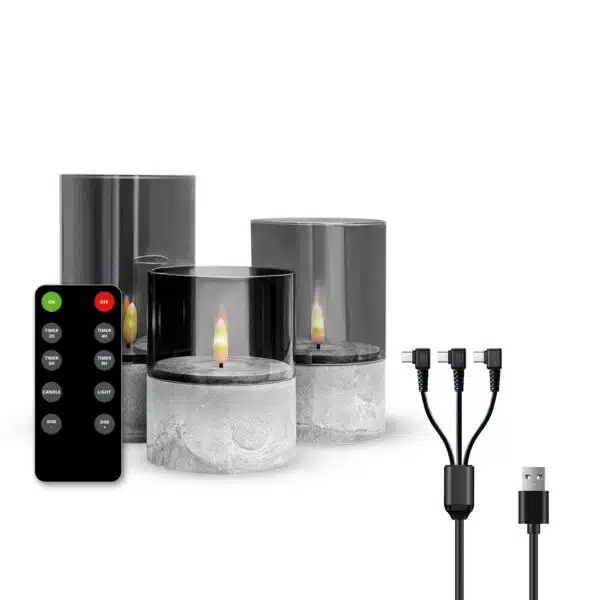 Creรซer de perfecte sfeer in je huis, tuin of omgeving met de FlinQ Stone Look Oplaadbare Kaarsen. Deze set, met een luxe stenen look en elegante smoked glass-cilinders, voegt een extra vleugje stijl toe aan elke ruimte. Met de handige afstandsbediening heb je talloze opties om de perfecte sfeer te creรซren. De kaarsen zien er verbluffend realistisch uit en zijn daarnaast veilig en duurzaam, wat ze ideaal maakt voor iedere gelegenheid!