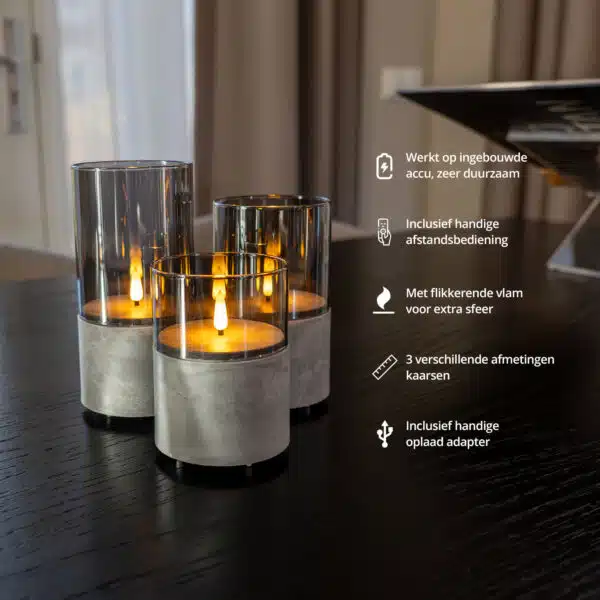 Hรฉt voordeel van deze stone look LED kaarsen set is dat de drie kaarsen op te laden zijn met de meegeleverde usb-kabel. Je hoeft dus geen batterijen meer te vervangen. Een duurzame kaars dus!