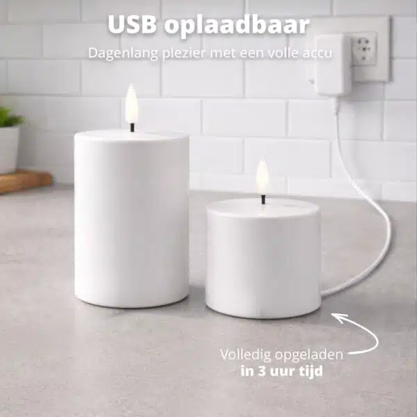 De LED-kaarsen zijn volledig oplaadbaar via USB en bieden tot wel 30 dagen sfeerlicht op één lading. Binnen 3 uur zijn ze volledig opgeladen, waarna je er weken plezier van hebt. Geen gedoe meer met losse batterijen en altijd duurzame verlichting binnen handbereik.