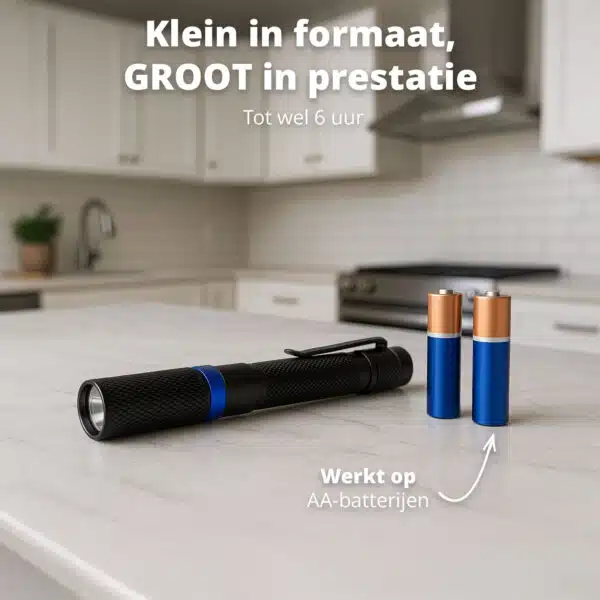 De Pen Flashlight werkt op 2 AAA-batterijen (niet inbegrepen), waardoor je nooit hoeft te wachten op opladen. Batterijen zijn overal makkelijk verkrijgbaar, perfect tijdens noodsituaties, survivaltrips of op momenten dat je direct licht nodig hebt. De zaklamp blijft betrouwbaar functioneren tussen -10 ยฐC en +40 ยฐC.