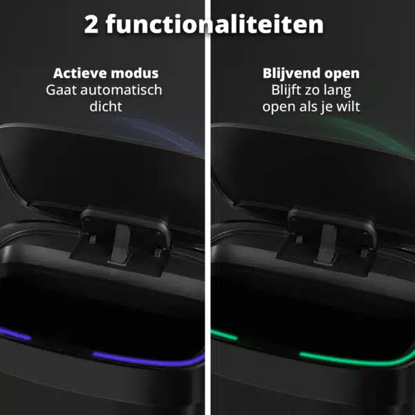 Met de ingebouwde sensor opent het deksel automatisch zodra je handen of afval zich binnen 25 cm bevinden. Dit gebeurt in slechts 0,3 seconden. Zo blijf je hygiรซnisch รฉn houd je altijd een hand vrij. De randverlichting geeft de status duidelijk aan: blauw bij automatische modus, groen bij โ€˜blijvend openโ€™. Sluit het deksel geruisloos dankzij de softclose-functie.