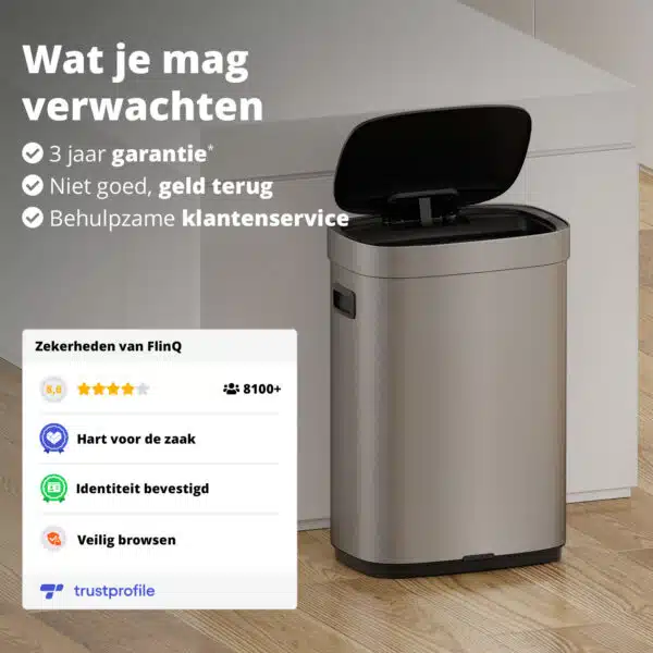 De FlinQ Mira Sensor Bin is een geavanceerde prullenbak die functionaliteit, hygiรซne en design samenbrengt. Dankzij de slimme sensortechnologie en het oplaadbare deksel met bewegingssensor is deze 50 liter RVS prullenbak dรฉ moderne oplossing voor elke ruimte in huis.