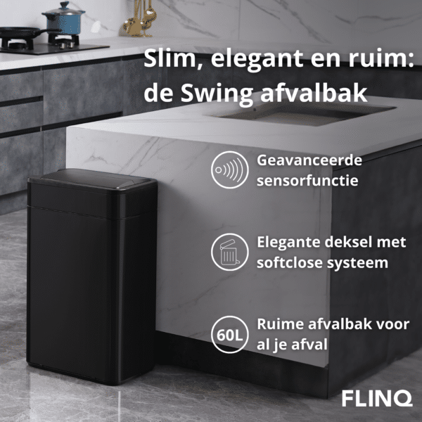 De veelzijdigheid van de FlinQ Sensor Bin Swing 60L kent geen grenzen. Plaats hem in je keuken om een overvloed aan keukenafval aan te pakken, in kantoorruimtes voor een nette werkplek, in drukke entrees om het afval op efficiënte wijze te beheren, of zelfs in commerciële locaties voor een stijlvolle afvaloplossing. Waar je ook besluit om hem neer te zetten, de FlinQ Sensor Bin Swing 60L past naadloos bij elke ruimte en voegt een vleugje slimme elegantie toe aan je dagelijkse routines.