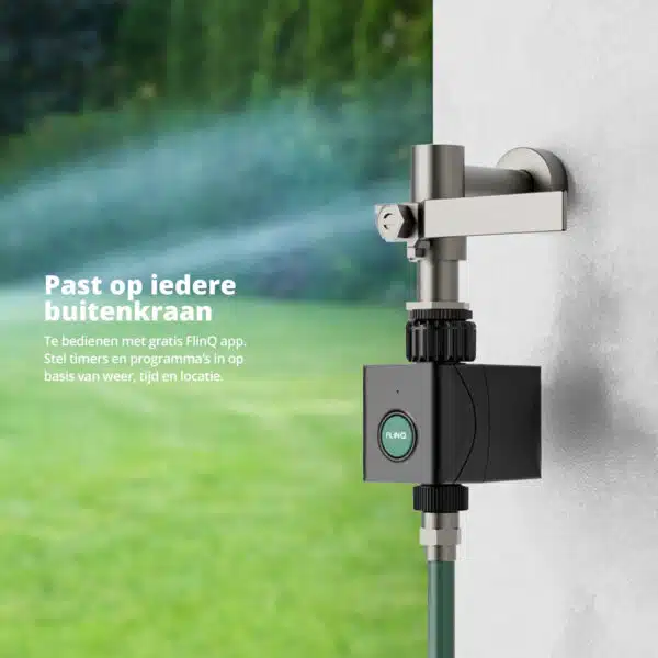 De slimme irrigatie controle van FlinQ installeert u direct op uw waterkraan (past op iedere waterkraan*).