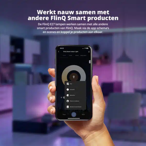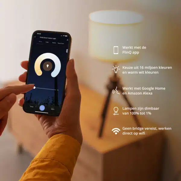 Met de FlinQ App kun je de slimme lampen in elke kamer van je huis bedienen. Voeg al je slimme lampen toe en bedien ze allemaal eenvoudig met je smartphone of tablet. De FlinQ App is verkrijgbaar in de App Store of Google Play Store.