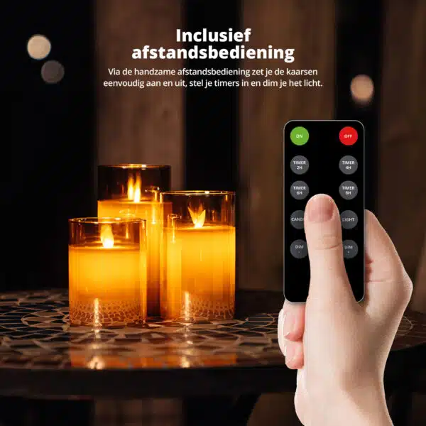De gezellige kaarsen worden standaard geleverd met een afstandsbediening. Die is voorzien van knopjes voor alle functies. Zo kun je de kaarsen bijvoorbeeld dimmen, waarmee je met een druk op de knop de sfeer in huis bepaalt. Of je stelt een timer in, waardoor je precies weet hoelang de kaarsen zullen โbrandenโ.