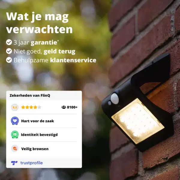 Afhankelijk van de interne accu en het type zonne-paneel kan een solar lamp van FlinQ tot wel 32 uur mee gaan op een volledige accu. De plaatsing van de lamp evenals de sterkte van de zon i.c.m. de hoeveelheid zonuren op een dag bepalen hoelang een solar lamp kan branden. Zorg er bij installatie voor dat de lamp gedurende de dag voldoende zonlicht krijgt.