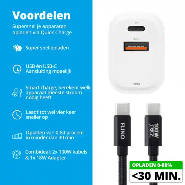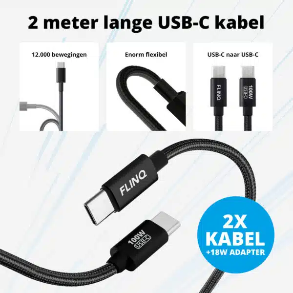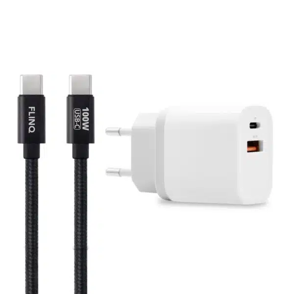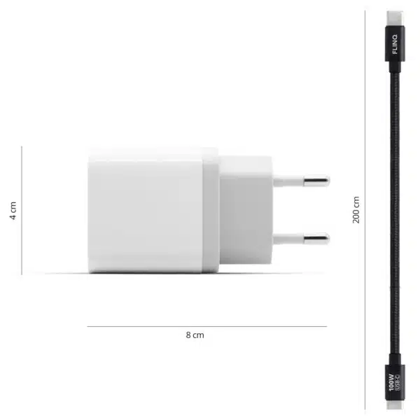 FlinQ Power Charger + 100W USB-C Kabels โ De Perfecte Snellaadset voor Jouw Smartphone of tablet.