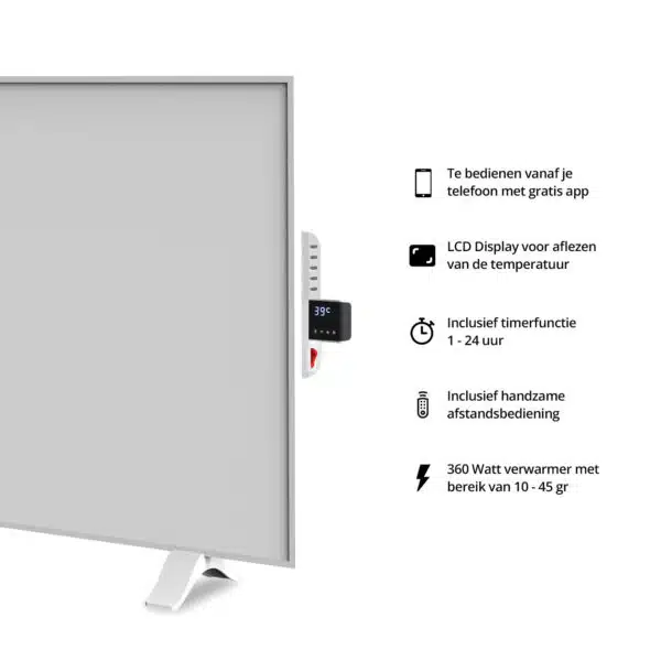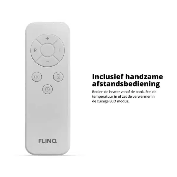 De Slimme IR Heater van FlinQ is voorzien van een eco-modus, waardoor je nog zuiniger met je elektriciteit omgaat. Je verspilt dan op de momenten dat je niet zoveel warmte nodig hebt, een hoop minder energie. En omdat je gebruik kunt maken van de timerfunctie, kun je geheel naar wens instellen wanneer je wil dat de witte infrarood verwarmer aan en uit gaat. Zo hoef je op koude dagen überhaupt niet meer na te denken over de verwarming in huis.
