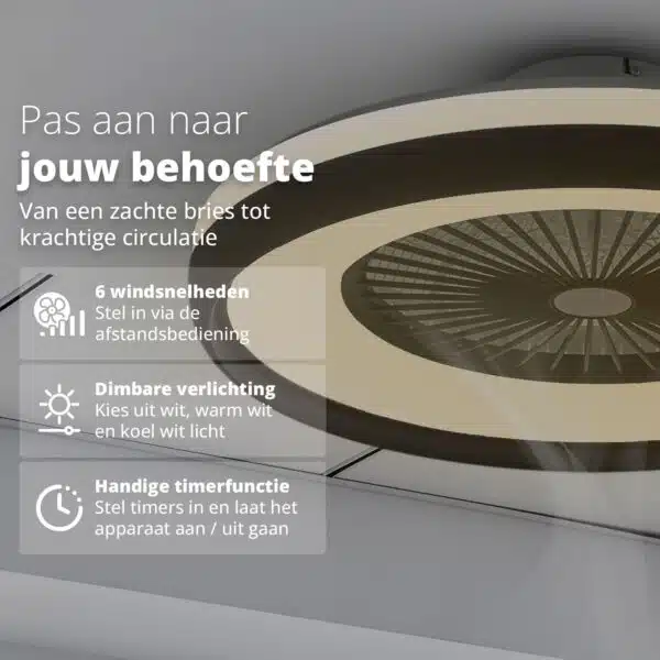 De bladloze constructie en flush mount-bevestiging geven deze ventilator een strakke uitstraling die past in elk interieur. Dankzij het compacte ontwerp is hij uitermate geschikt voor ruimtes met een lager plafond. Of je hem nu in de woonkamer, slaapkamer of werkkamer plaatst, deze ventilator voegt comfort, stijl รฉn slimme functies toe aan elke omgeving.